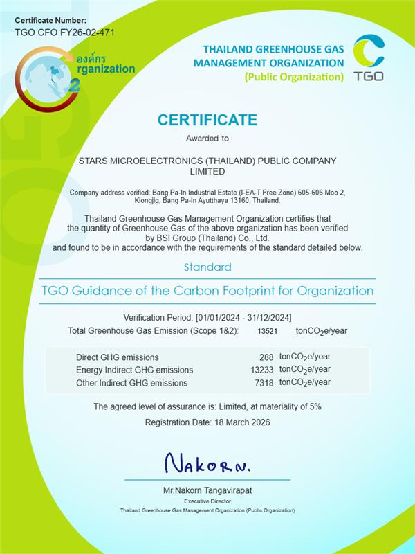 STARS Microelectronics (Thailand) Public Company Limited, or SMT, a Thai electronic components manufacturer and assembler, continues to strengthen its environmental standards by receiving the Carbon Footprint for Organization (CFO) certification. This recognition reflects the company’s strong commitment to systematically managing and reducing greenhouse gas emissions, awarded by the Thailand Greenhouse Gas Management Organization (Public Organization).