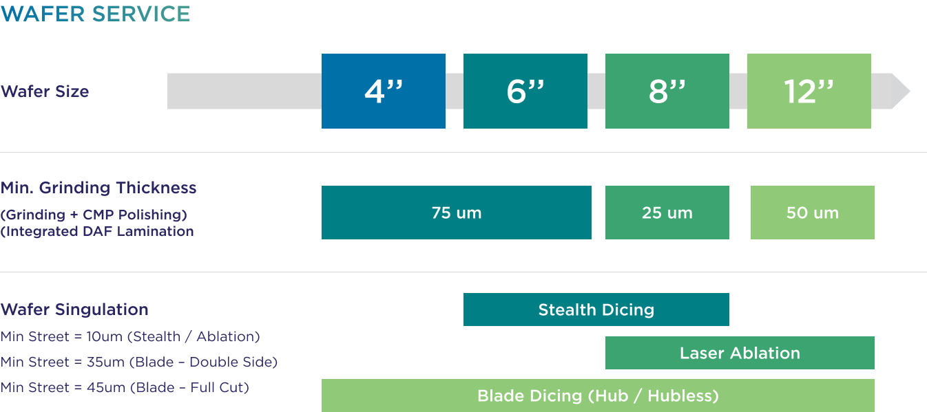 Equipped with high-precision, fully automated production lines, we provide manufacturing services from Wafer level processes to Assembly Semiconductor for both IC and Advance Packages.